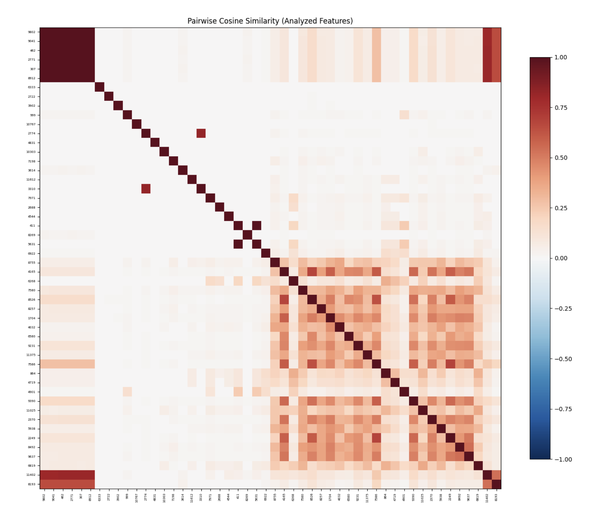 This specific image corresponds to an expansion factor of 16, sparsity penalty of \(1e-4\) with neuron sampling. Roughly all heat maps follow the same pattern. The strong correlation on the diagonal is expected trivially. What’s interesting is that there are two clusters that form on the top left and bottom right. Upon a very superficial analysis of these features, no immediate pattern stood out. However, this could benefit from a deeper study, which was not done at the moment due to time constraints.