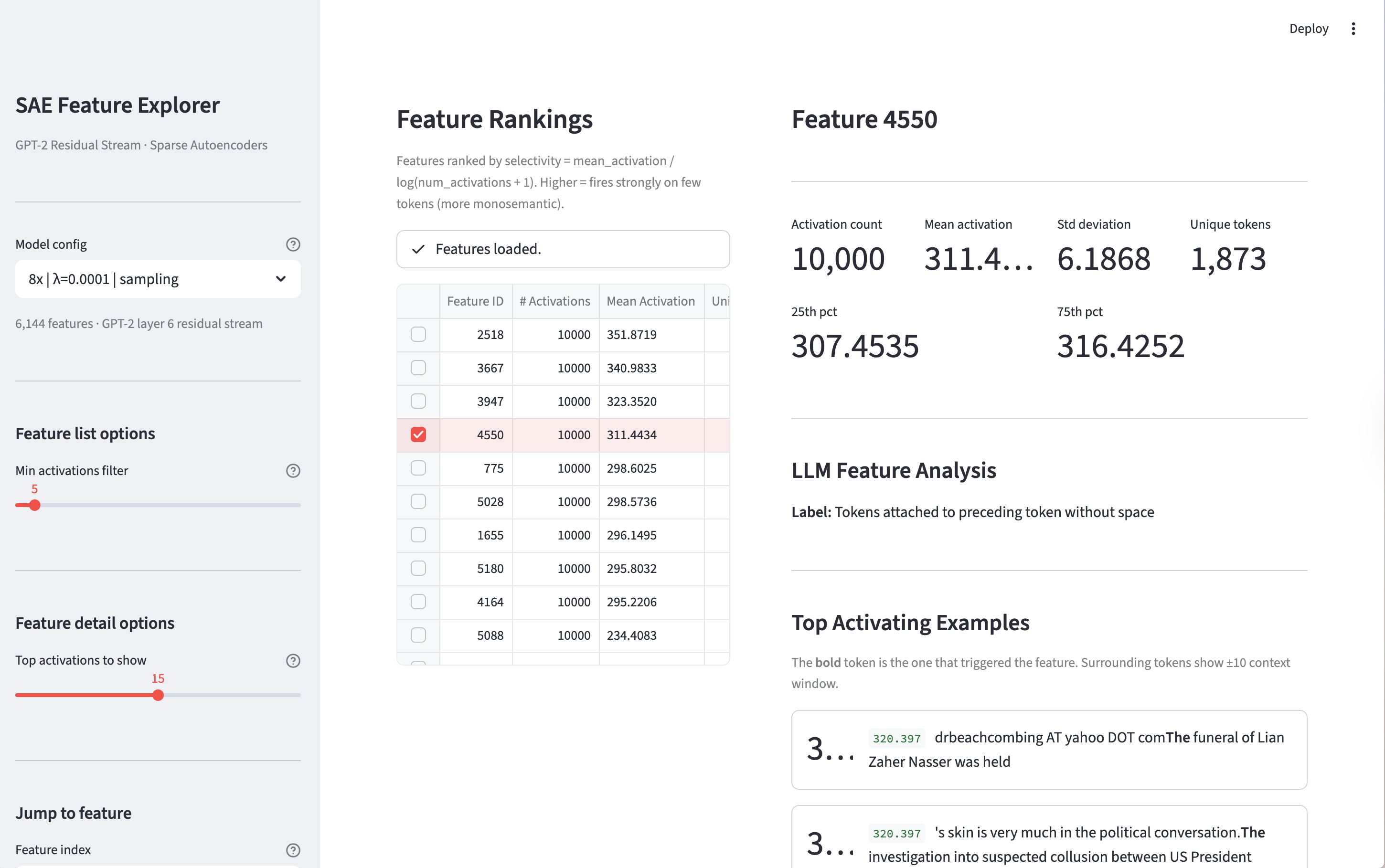 You can explore features interactively using the visualizer below. Note: this is experimental and may be unreliable — results can be slow, incomplete, or inconsistent depending on the model/config selected.