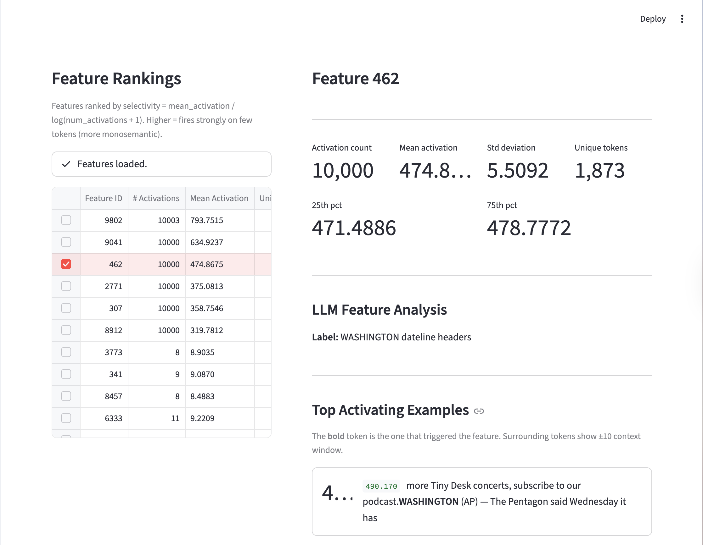 To analyze the features, we rank the features by selectivity and set a minimum activation count to 10. Selectivity is defined as \(\frac{\text{mean\_activation}}{\log(\text{num\_activations} + 1)}\) and minimum activation count ensures there are at least those many examples that cause that feature to fire. This is useful to remove features that rarely fire.